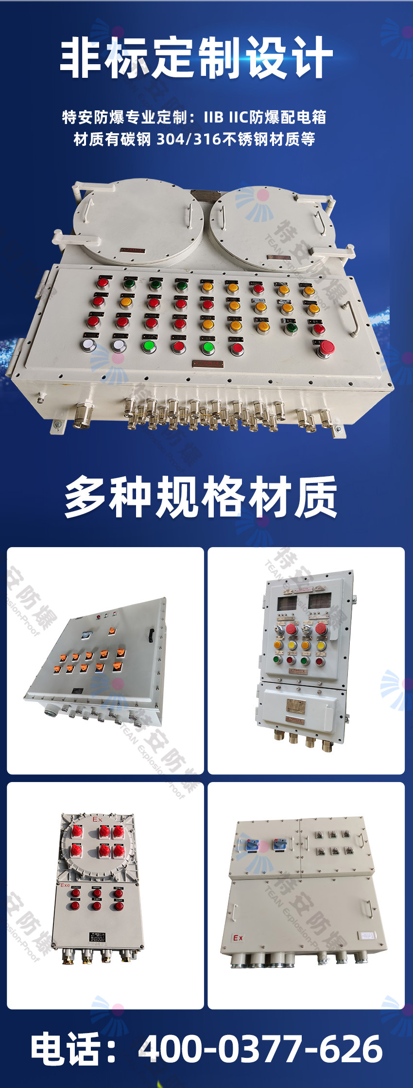 柜體外殼采用優(yōu)質(zhì)鋼板焊接成型,表面高壓靜電噴塑。內(nèi)裝各種防爆電器,可按照用戶提供的電氣原理圖及主要技術(shù)參數(shù)制定配電柜的外形尺寸并選用相應(yīng)的防爆電器,可根據(jù)要求制作成面板上直接操作或開(kāi)門后操作等形式。