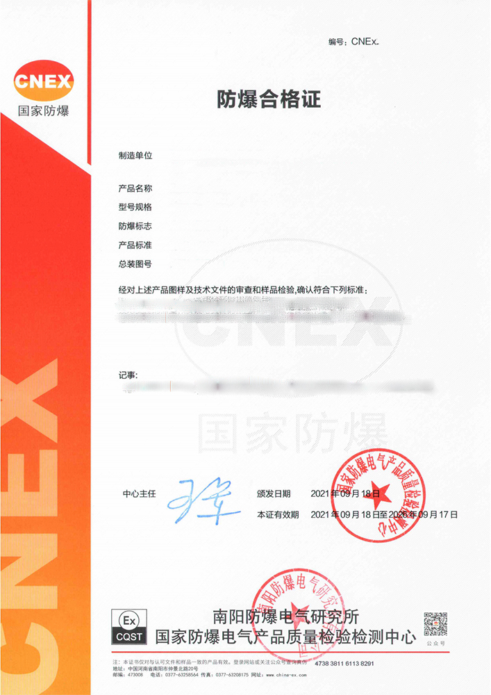 南陽防爆研究所頒發(fā)的防爆合格證。
